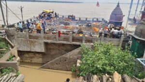 मान्यता है कि मणिकर्णिका घाट पर अंतिम संस्कार से व्यक्ति को जीवन-मृत्यु के चक्र से मुक्ति मिलती है,लेकिन श्रद्धा के इस पवित्र केंद्र को भी इस बार भी बाढ़ ने जकड़ लिया है।घाट पर शवदाह के लिए बनी सभी चिताएं पानी में डूब चुकी हैं, अब छतों को ही शवदाह स्थल बनाया गया है।शव यात्रियों को मजबूरी में कमर भर पानी से गुजरकर मृत देह को घाट की छत तक पहुंचाना पड़ रहा है।