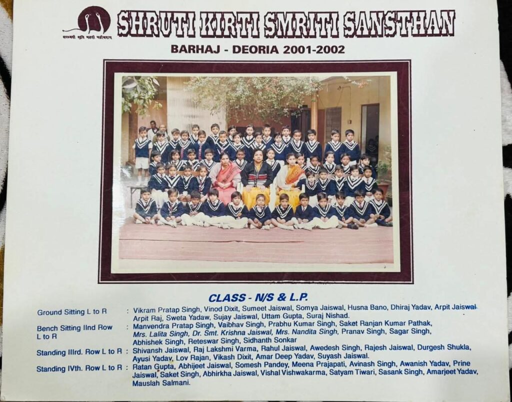 इस वक्त उक्त फोटो इस बात का प्रमाण है की श्रुति कीर्ति जो 9 महीने मेंरे गर्भ में रही और 4:30 महीने में उसका मृत्यु हो गया और उसकी स्मृति में मैंने यह कान्वेंट स्कूल डाला था।
