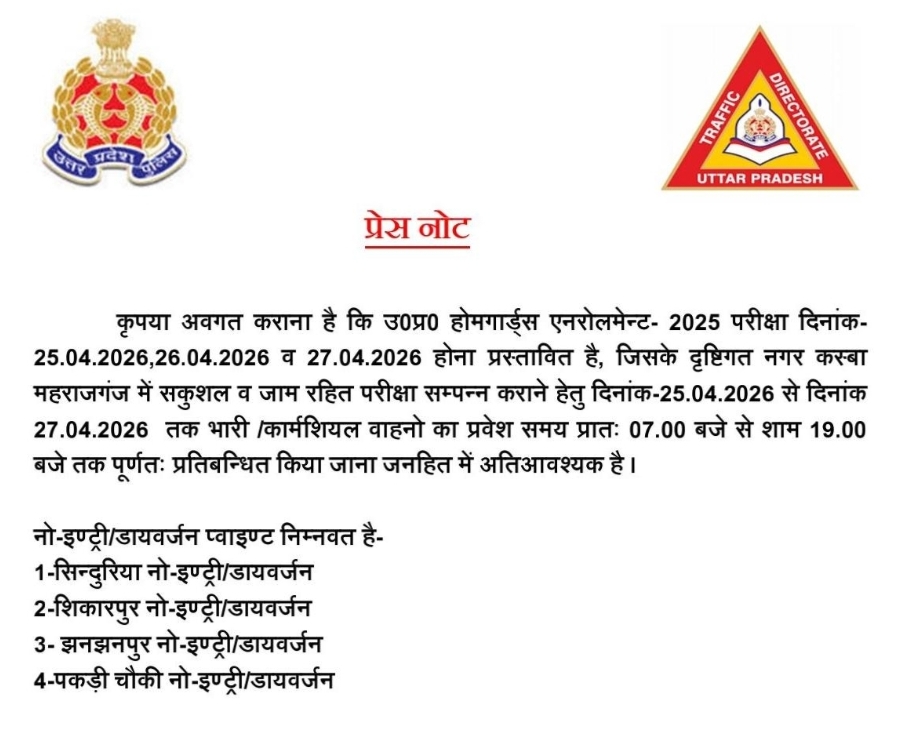 महराजगंज। उ०प्र० होमगार्ड्स एनरोलमेन्ट-2025 परीक्षा को शांतिपूर्ण, सुरक्षित और जाममुक्त तरीके से संपन्न कराने के लिए प्रशासन ने सख्त ट्रैफिक व्यवस्था लागू करने का निर्णय लिया है। यह परीक्षा 25 अप्रैल से 27 अप्रैल 2026 तक आयोजित की जाएगी, जिसके मद्देनजर नगर कस्बा महराजगंज में भारी और कॉमर्शियल वाहनों के प्रवेश पर पूर्ण प्रतिबंध लगाया गया है।