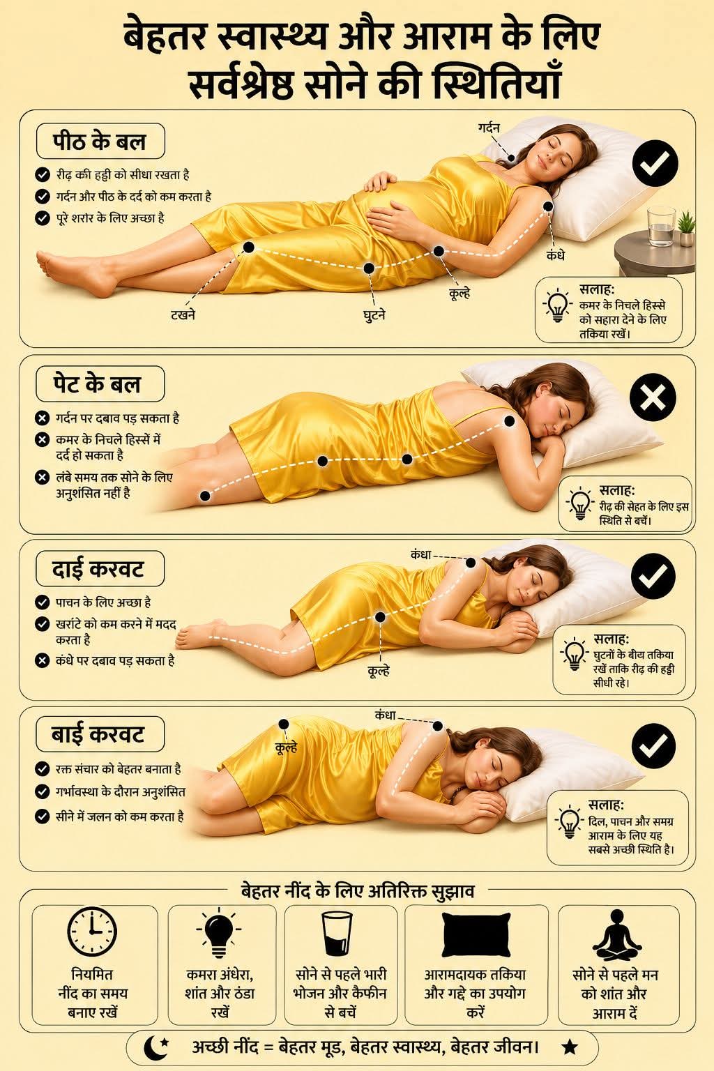 बेहतर स्वास्थ्य और आरामदायक नींद के लिए सही सोने की स्थितियों (Sleeping Positions) को आसान भाषा और चित्रों के माध्यम से समझाता है। इसमें चार मुख्य पोजीशन—पीठ के बल, पेट के बल, दाईं करवट और बाईं करवट—को दिखाया गया है और बताया गया है कि कौन-सी स्थिति शरीर के लिए फायदेमंद है और कौन-सी नुकसानदायक हो सकती है।