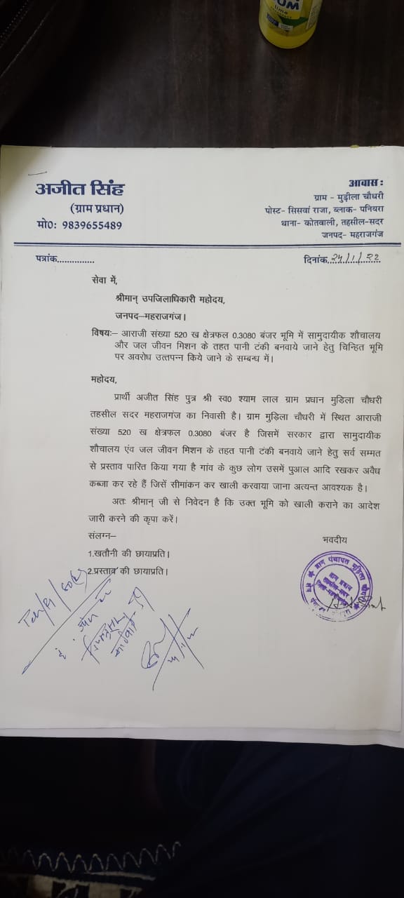 महराजगंज, पनियरा ब्लाक अंतर्गत ग्राम सभा मुड़ीला चौधरी के ग्राम प्रधान ने अजित सिंह ने बंजर जमीन के अवैध कब्जा धारियों से कब्ज़ा मुक्त करने के लिये लिखित प्रार्थना पत्र के जरिये अवगत कराया।