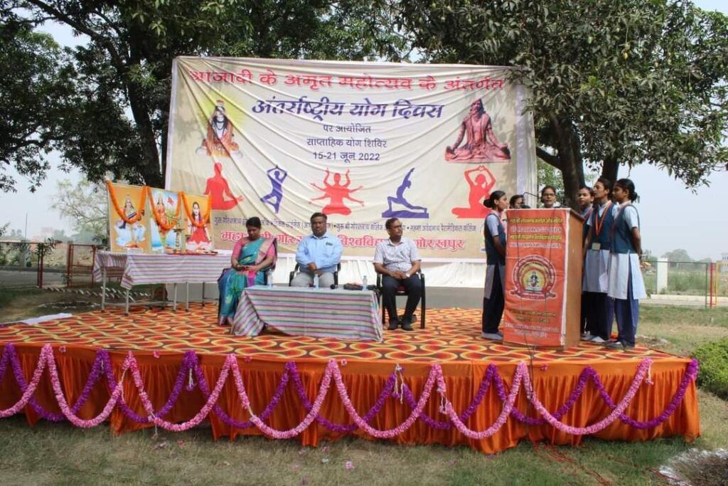 महायोगी गोरखनाथ विश्वविद्यालय गोरखपुर में आजादी के अमृत महोत्सव के अंतर्गत अंतराष्ट्रीय योग दिवस पर आयोजित योग सप्ताह का शुभारंभ आज दिनांक 15 जून 2022 को प्रातः 8 बजे से किया गया । कार्यक्रम में मुख्य अतिथि के रूप में डा. अश्विनी कुमार मिश्र, क्षेत्रीय उच्च शिक्षा अधिकारी गोरखपुर रहे ।