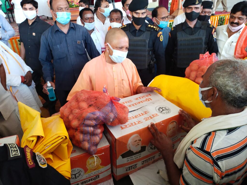 राहत सामग्री वितरण करने के बाद सीएम योगी ने लोगों को संबोधित करते हुए कहा बाढ़ प्रभावित क्षेत्रों में राहत सामग्री,मवेशियों के लिए चारे की व्यवस्था व बाढ़ का पाने से डायरिया व अन्य रोग के निवारण के लिये स्थानीय प्रशासन को निर्देश दे दिए गए हैं,पानी गर्म पीने का लोगो को सलाह दिये,बाढ़ से प्रभावित लोगो को अगर जनहानि होती है तो 4लाख रुपया,मकान क्षतिग्रस्त होता है तो 95000/-की राशि,पशु हानि व बाढ़ के बहाव मे क्षतिग्रस्त पक्का मकान के गिरने पर भी तहसील प्रशासन की तरफ से आर्थिक सहायता मुहैया कराई जाएगी,उद्बोधन समाप्ति के अंत में सीएम योगी ने भाजपा नेताओं से बाढ़ प्रभावित क्षेत्रों का वास्तविक जानकारी लिये,उसके बाद सीएम योगी 4:30 बजे हेलीकॉप्टर द्वारा सहजनवा के लिए रवाना हो गये,